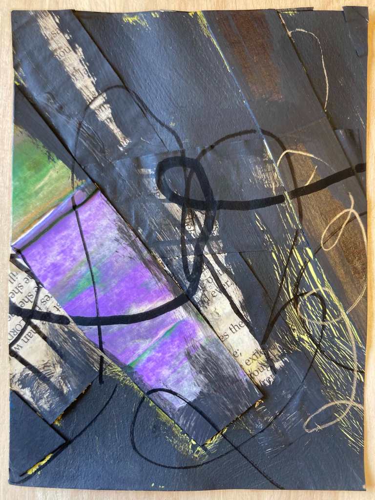 In this April 2026 collection, “New Light, Returning Daily,” I wanted to explore using familiar materials with unfamiliar methods. I combined off-cuts from my “scrapings” paintings, pages from a rescued Bible that had been damaged, and a variety of mixed media materials to make something new with collage in a cohesive collection. When I consider how day-to-day life can feel mundane, the same day-after-day, or simply a repeat of dull life that offers next to no progress, I easily miss the beauty in small, secret, quiet moments. As this series of 30 pieces unfolds, I created it to capture the variety, emotions, beauty, and depth of everyday life on the daily; viewing each piece (or, each day this month) separately may reveal one thing for a viewer, but to experience each piece together may offer a new perspective, a new light, on our everyday mundane upon returning daily.