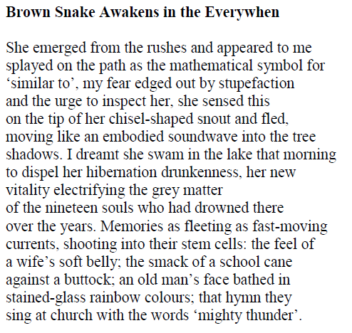 First, thank you so much, Nigel, for giving me this opportunity to reveal a bit more about the poem Brown Snake Awakens in the Everywhen from Alchemy (Turas Press), my first collection. I very much enjoy reading other poets’ contributions on your blog. This poem was inspired by a brief encounter with a brown snake whilst walking around Lake Monger in Western Australia. Often my poetry involves the unravelling of a memory, and occasionally animals appear in a symbolic way. Even though I had been living in Australia for a while, there was still something shocking and primeval about a snake crossing my path. The poem didn’t emerge…