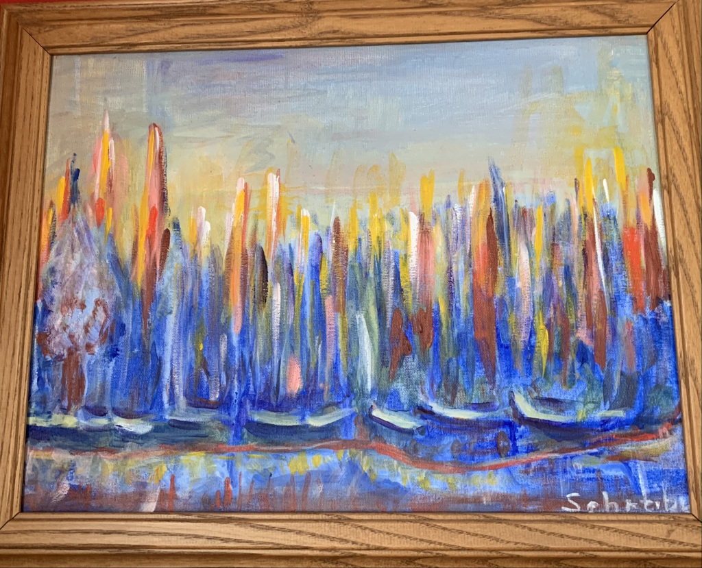 A late message from the Oracle today. We’ve had blue sky and sparkling water the last couple of days. As I was getting ready to post this, I looked up and saw this painting of my mom’s. It doesn’t have a title or date that I know of, but it seemed to fit.