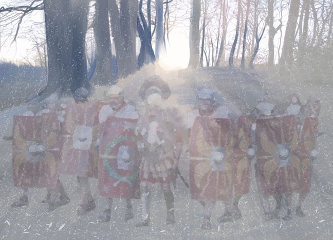 Over the hill comes the crest of a centurions helmet