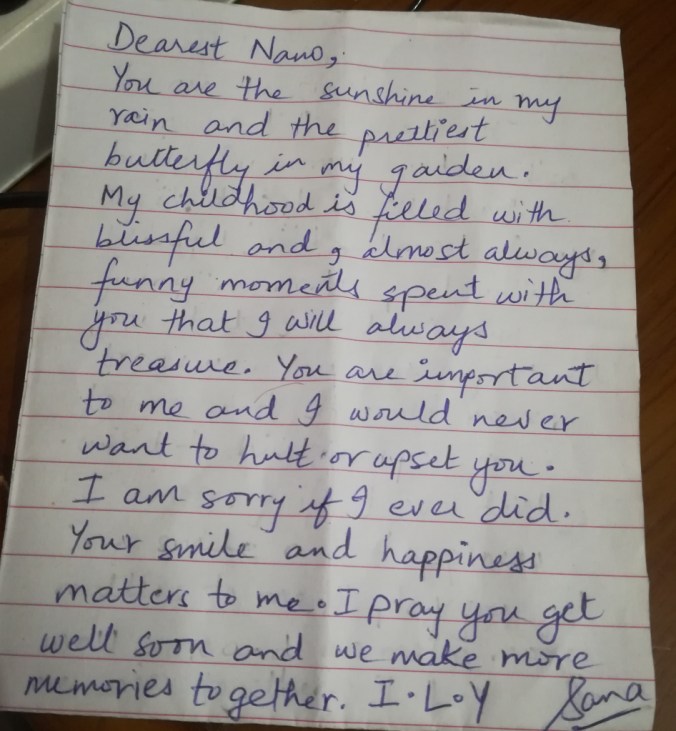 When my illness and a major surgery became a matter of grave concern for the family,this love filled letter and art work made me cry.Tears kept flowing for long.