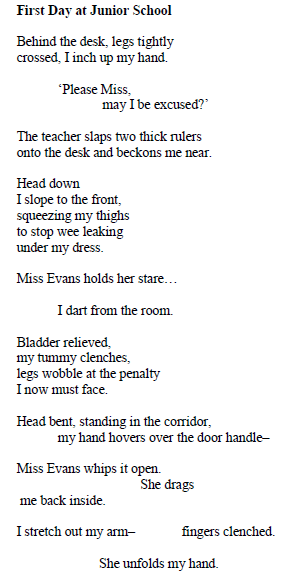 . I chose this one because it shows what corporal punishment was like in schools during the early sixties. Even, as in my case, if a child hadn’t actually done anything wrong. The poem recalls my class teacher when first going up to Juniors. Miss Evans (that wasn’t…