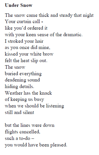 Thank you Nigel for showing an interest in my first collection of poems “Snake Skins” and for inviting me to share my processes and inspirations for one particular poem. It’s been strange looking at it again after some time and trying to fathom exactly why I did choose to write it like that. Not as easy as I first thought. Perhaps that’s why I’ve chosen “Under Snow” it seems a quiet unassuming little poem and I suspect that’s why it’s where it is in the collection – but don’t be fooled.
