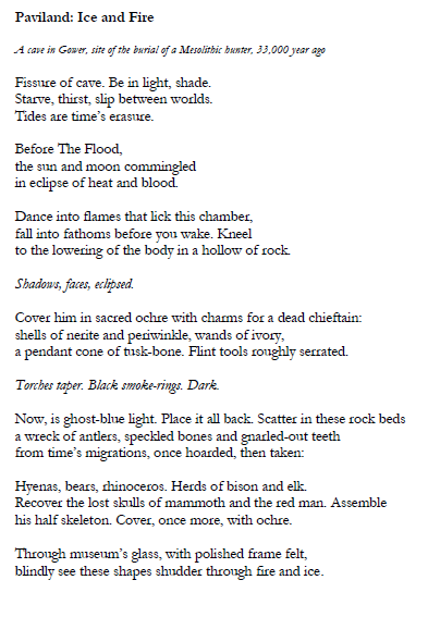 The poem takes the reader on a dizzying, intense, time-travelling journey to a cave on the Gower peninsula where a palaeolithic hunter is buried – popularly known as the ‘Red Lady’ of Paviland – but was, in fact, a male, Ice Age hunter. There’s an aspect of shamanism and ancient ritual in this poem set 34,000 years ago at a primitive, solemn scene of burial, where a man was buried…