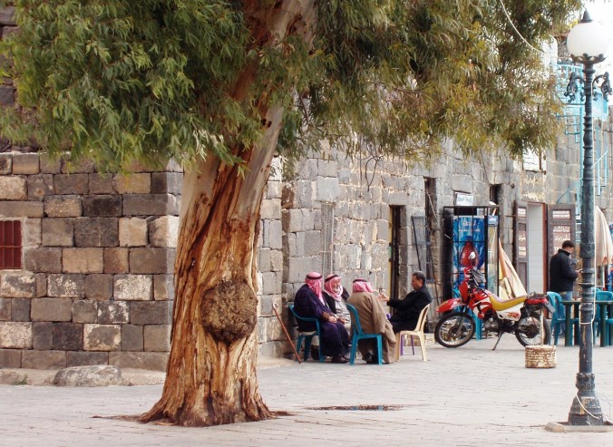 in kaffiyehs sitting in plastic