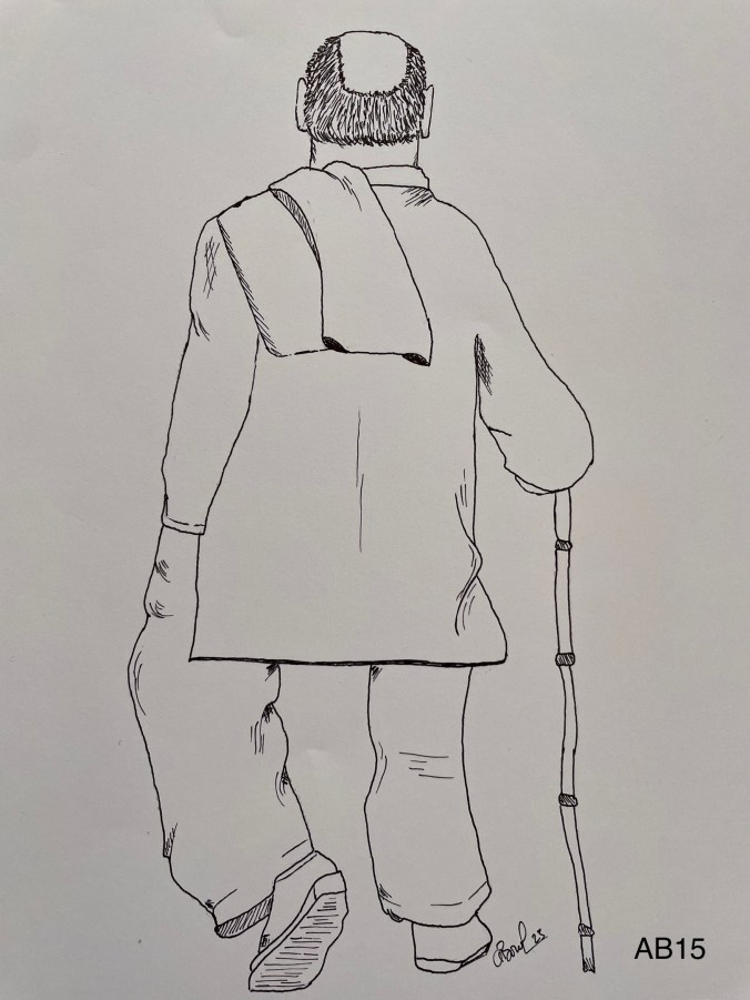 Johnny Appleseed, out of work, walking stick in hand