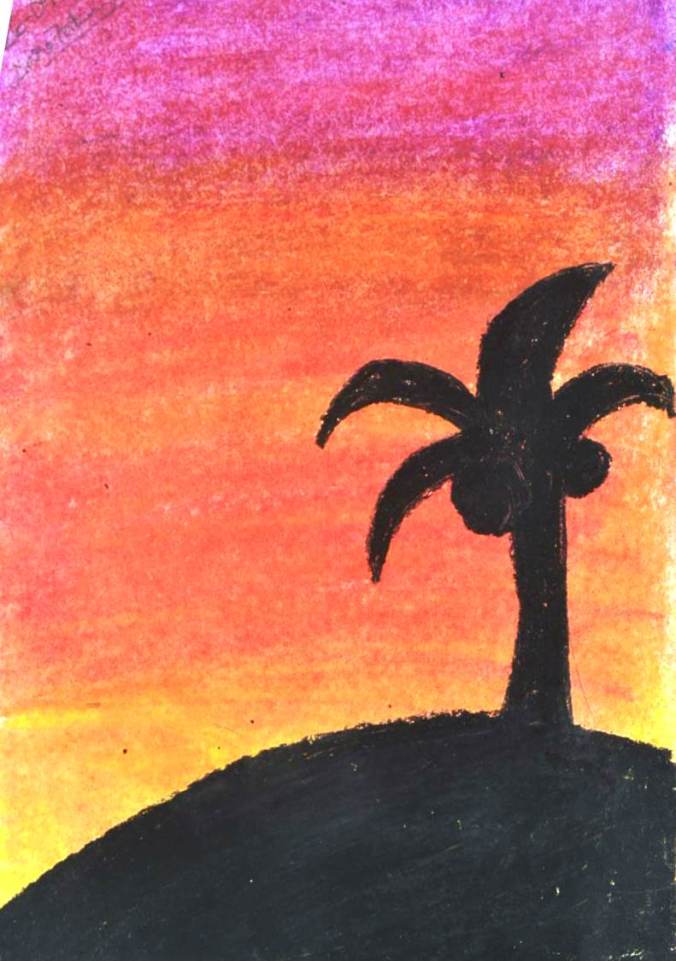A drawn palm tree on top of technicolour sunset hill.