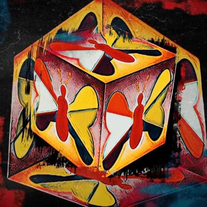 The accompanying image is of a rainbow butterfly that is actually a mash up oftwo concepts: 1 capitalism’s funnel of both buyers & sellers on the butterfly’s wings & 2 the colors of the butterfly which reflect how control & power control both parties intellectually & physically in all aspects of life. The cube that’s been transposed & misaligned to do a mirror is a metaphor of how social media used by power figures whether they be politicians, businessmen, or religious figures affect how both parties perceive & navigate their reality