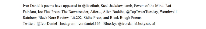 #NotAdvent Day Seven. Enjoy the poetry and prose of Ivor Daniel. For December go against the flow with me, instead of an Advent Calendar I am having an online Disappearance poetry calendar. Thinking of Extinction events, disappearing wildlife, disappearing homes due to war, thinking of the missing during Christmas. Seventh Day.