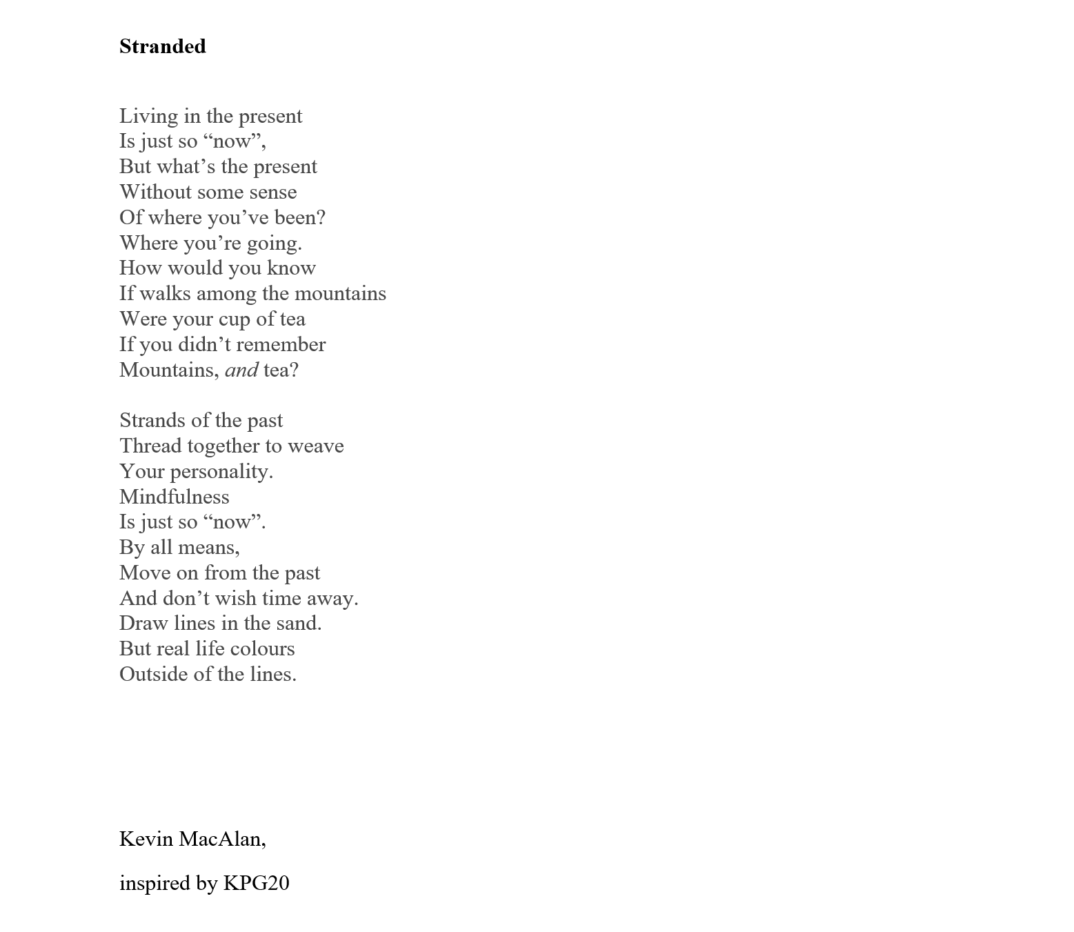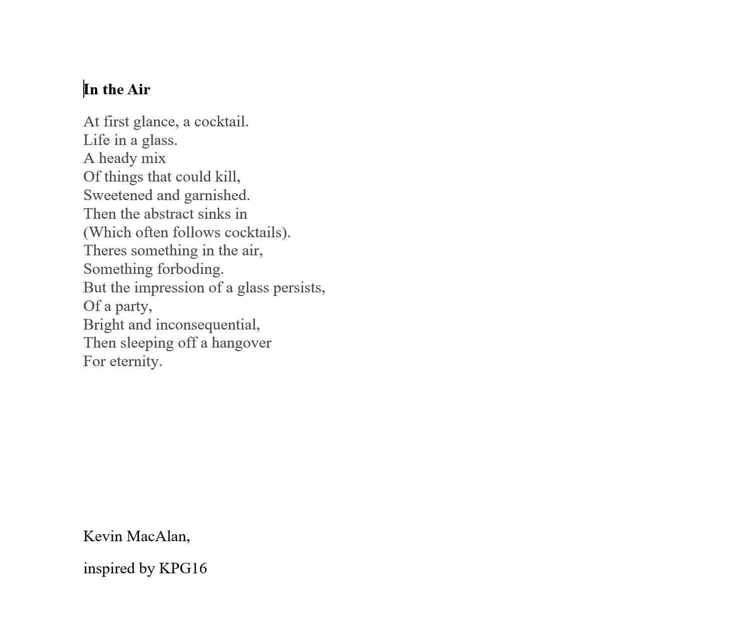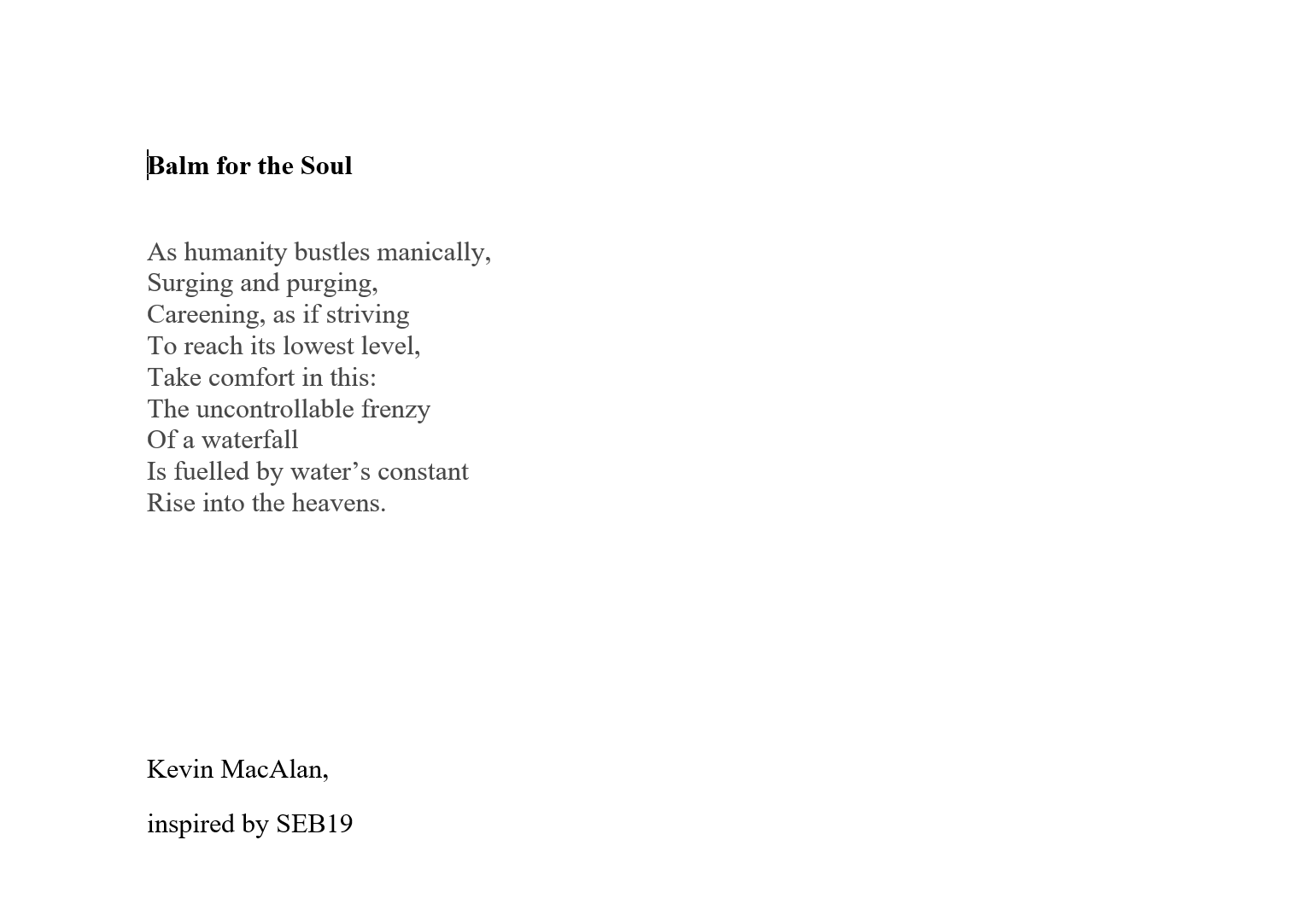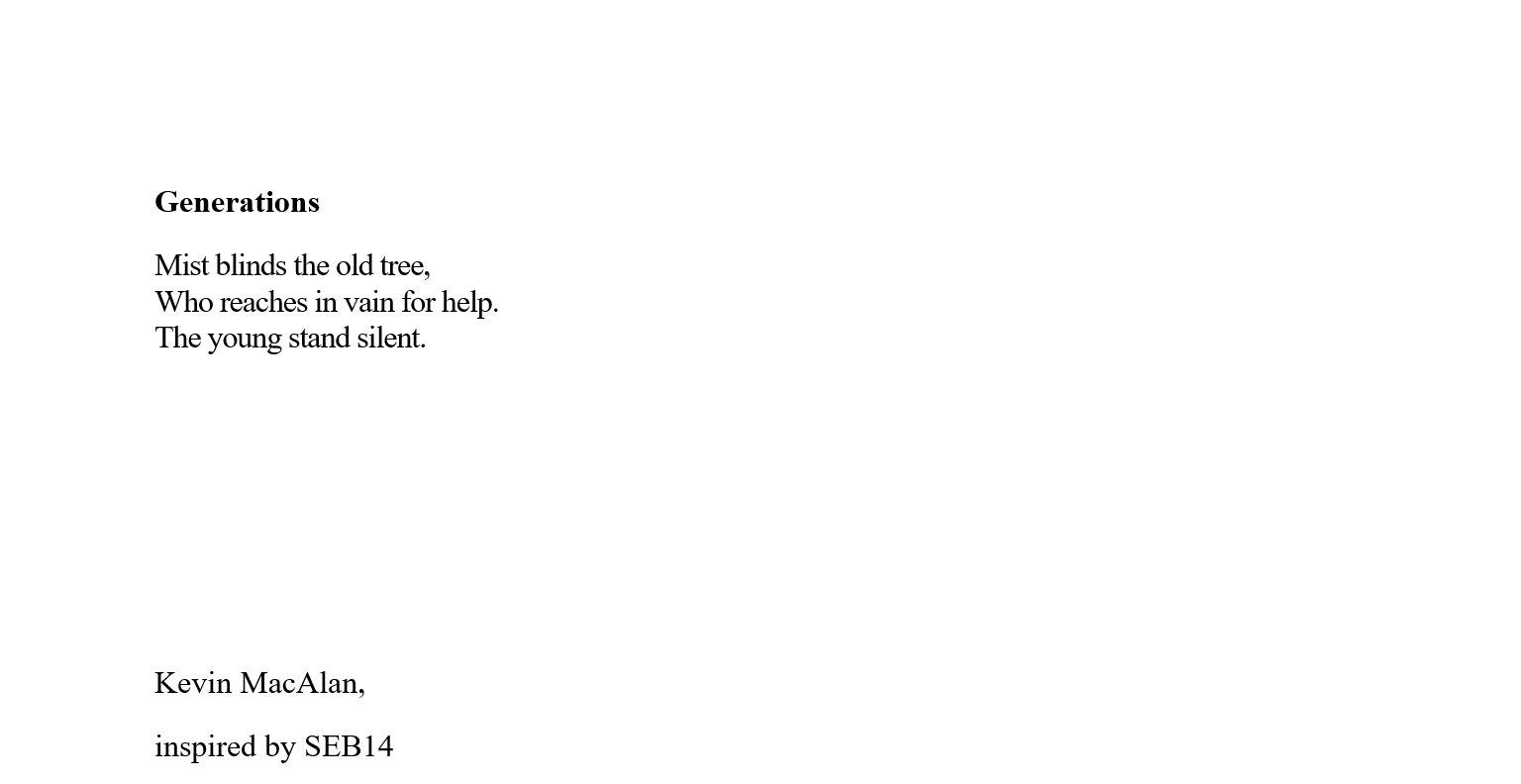 Kevin MacAlan’s home is in rural Co Waterford. He has an MA in Creative Writing, and has contributed art, poetry and fiction to many journals, including The Waxed Lemon, An Áitiúil, Howl, Recesses, Bindweed, Purple Unicorn Media, Datura, The Fish Barrel Review, and The Martello. Recently long listed fit the Nstional poetry prize.