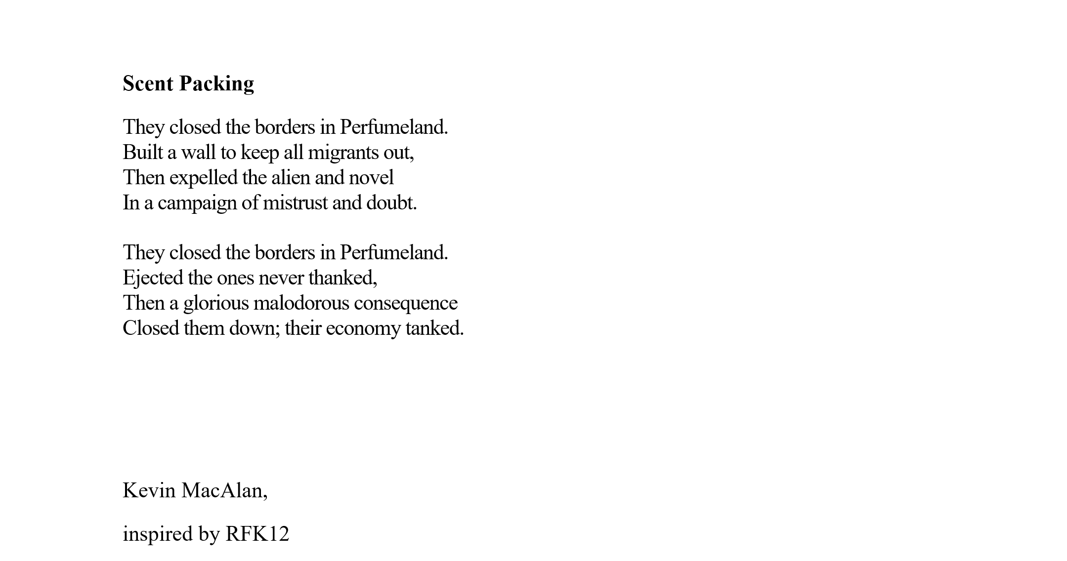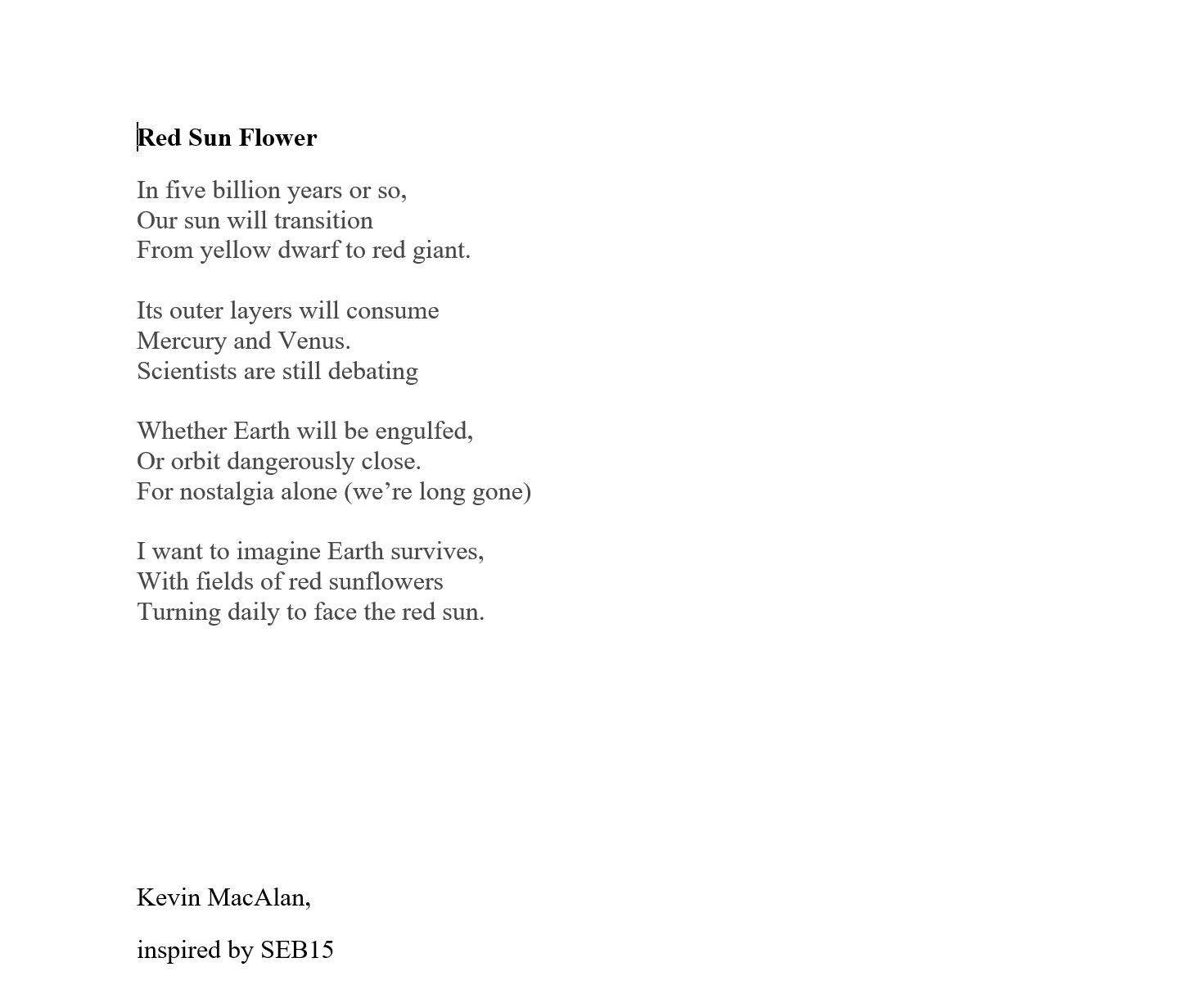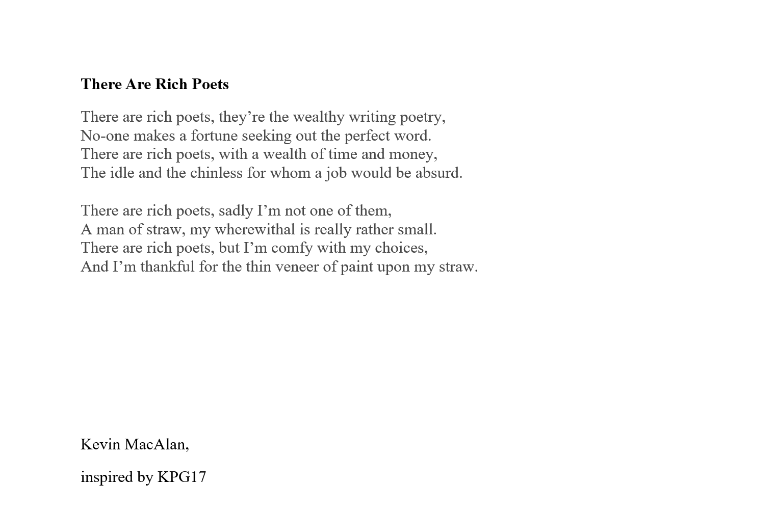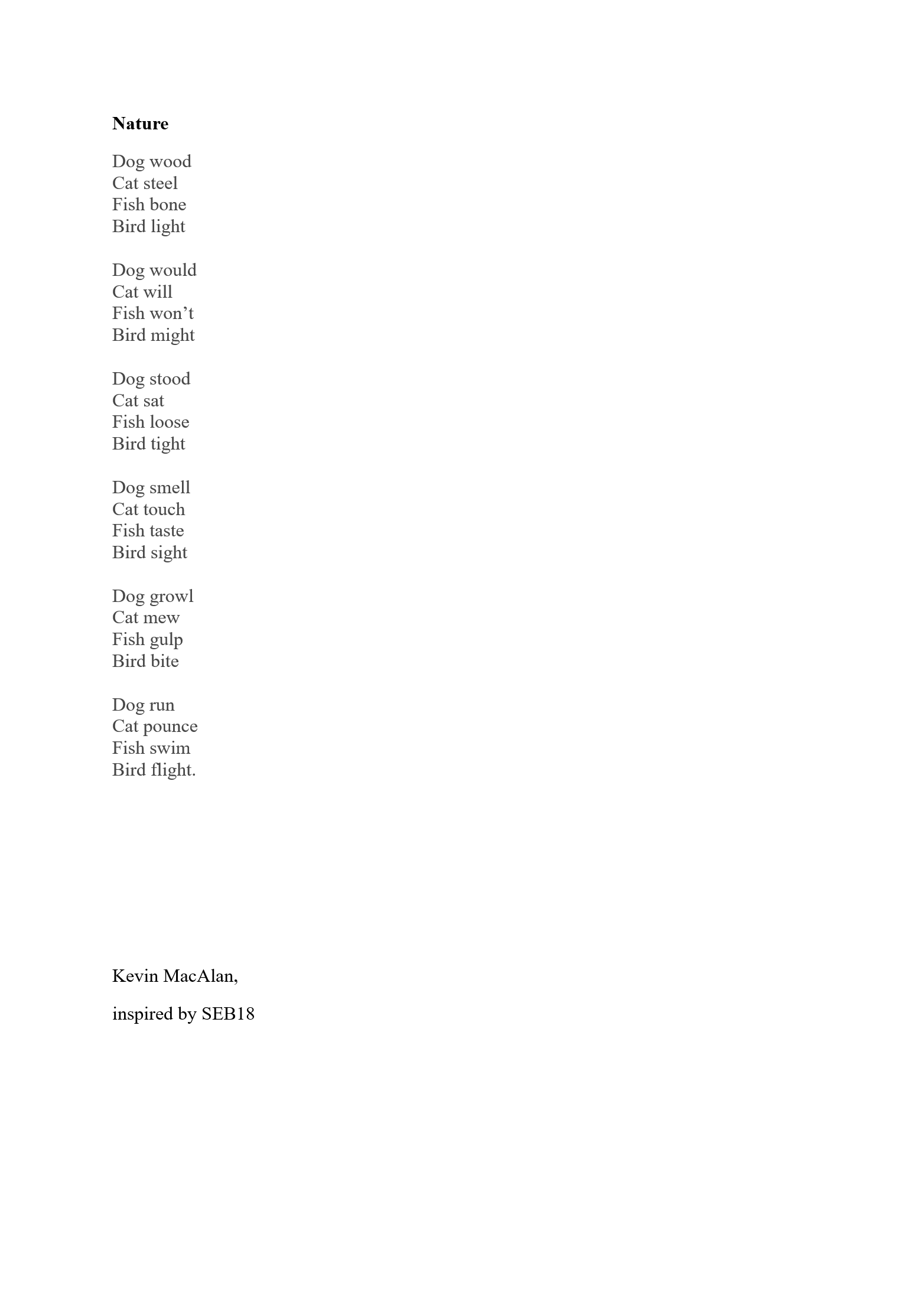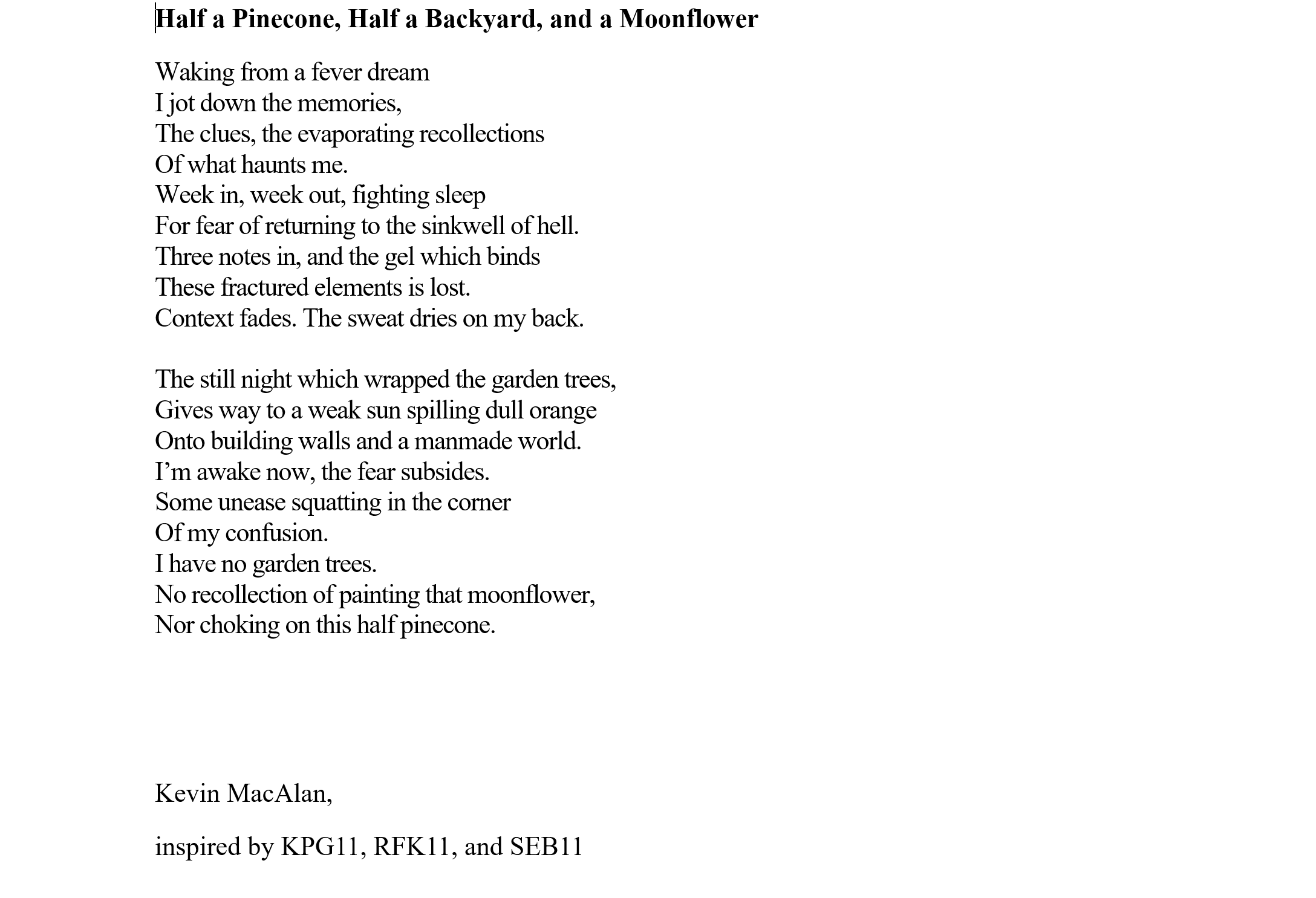 Kevin MacAlan’s home is in rural Co Waterford. He has an MA in Creative Writing, and has contributed art, poetry and fiction to many journals, including The Waxed Lemon, An Áitiúil, Howl, Recesses, Bindweed, Purple Unicorn Media, Datura, The Fish Barrel Review, and The Martello. Recently long listed fit the Nstional poetry prize.