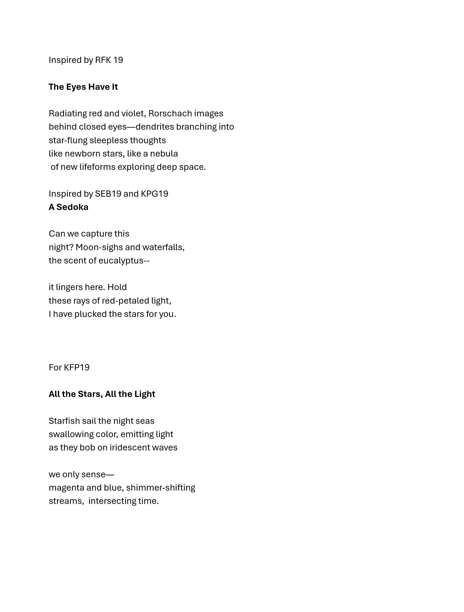 is an award-winning writer whose work has appeared in numerous print and online publications, radio shows, and podcasts. Her chapbooks include Coyote in the Basket of My Ribs (Kelsay Books), True North and Sightings from a Star Wheel (Origami Poems Project), and forthcoming Down River with Li Po (Black Cat Poetry Press). Writing credits also include several short plays staged through Fringe Festival of Marin (USA).