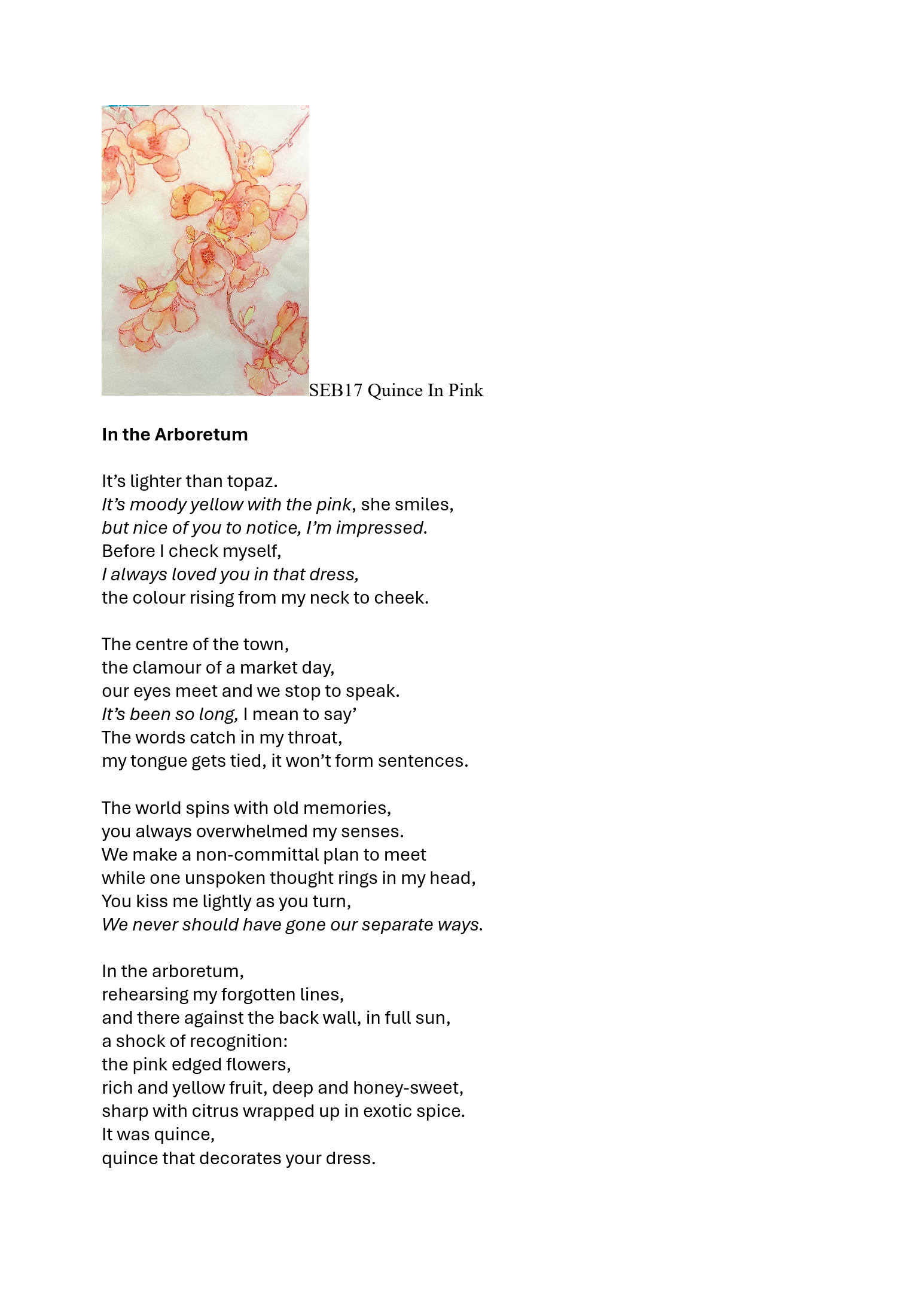 has six poetry books. She is published online and in print. Laurel prize nominated 2021 for ‘Where Flora Sings’. Forthcoming in 2024 new collection ‘Toccata and Fugue’ (Hedgehog Press), plus chapbooks from Dreich and Impspired