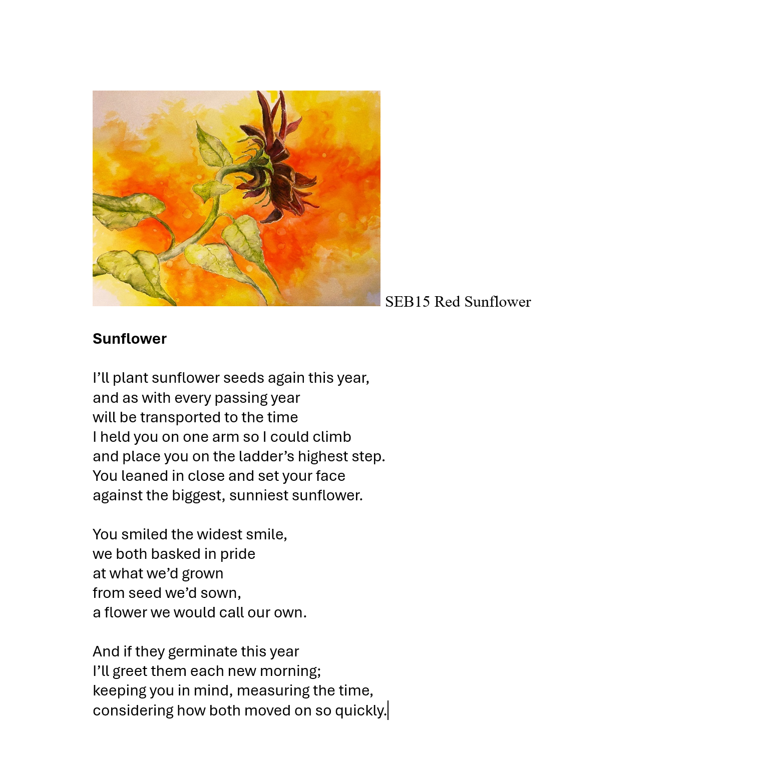 is the author of “Things My Mother Left Behind”, from Baxter House Editions, and “Tiger Lily” an Ekphrastic Collaboration with artist Jane Cornwell, published by JC Studio Press. Her poetry has appeared in The Storms,Crannog, Door is Ajar, California Quarterly, The Opiate Magazine, and Rust+Moth, among others. She also writes the blog, Stories from the Edge of Blindness, and hosts the podcast, A Thousand Shades of Green. You can find out more about Susan on her website,