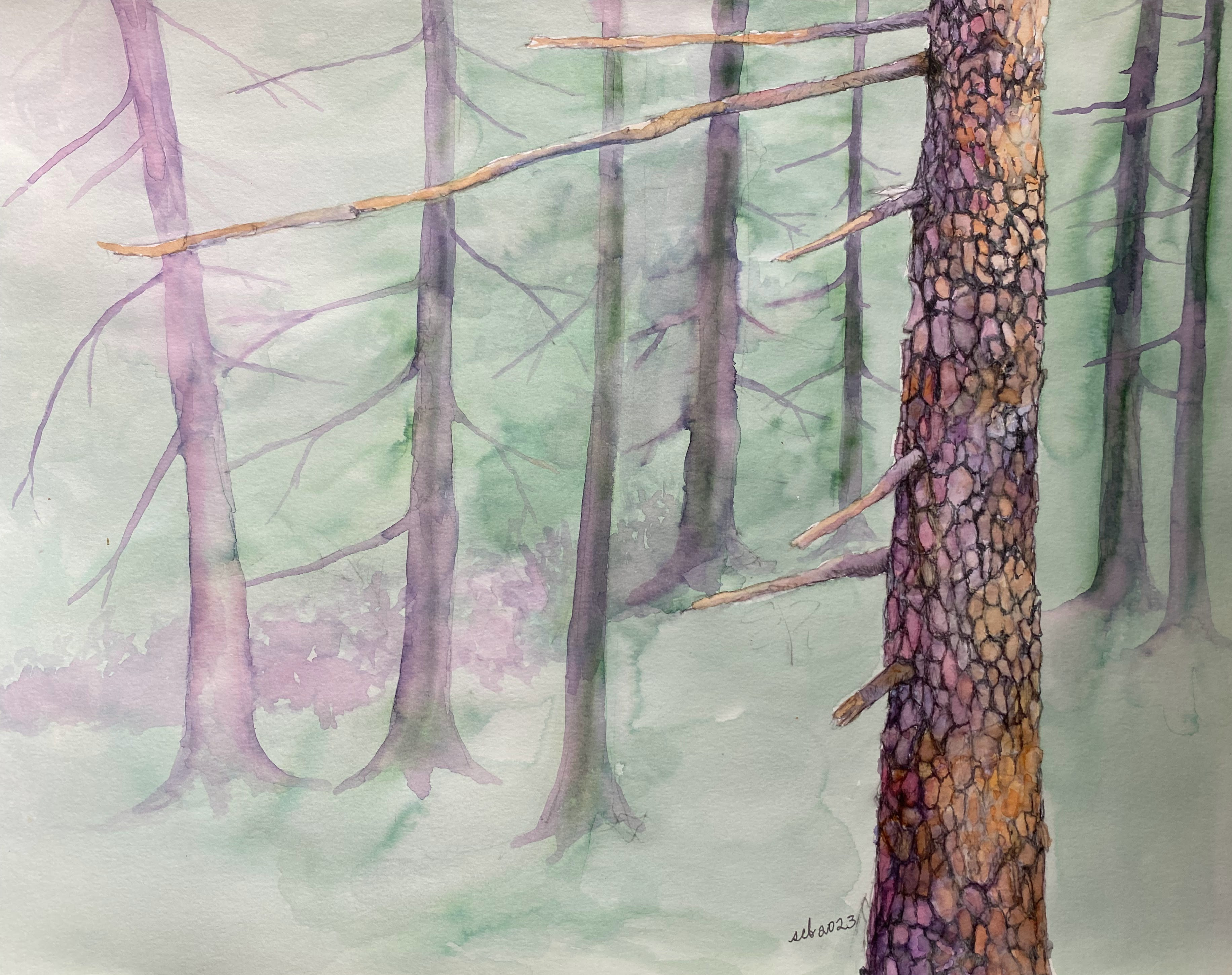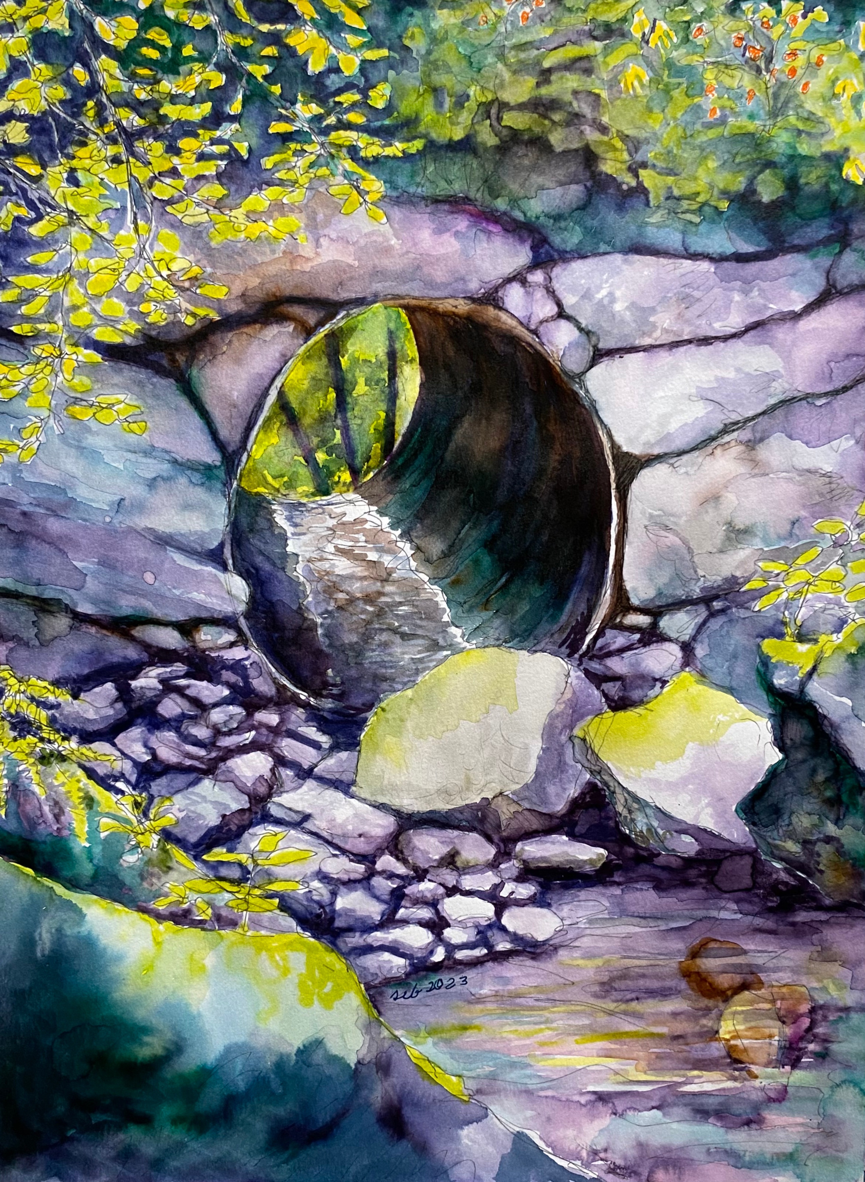 Most recently Sara has been working in a variety of water based mediums. Her primary modality is to go out into the woods, find a magical place that calls to be drawn and sketch it using water based ink pens. Then she returns to the studio and uses layers of water colors and other inks to fully develop the image capturing the peace and beauty of the natural world.