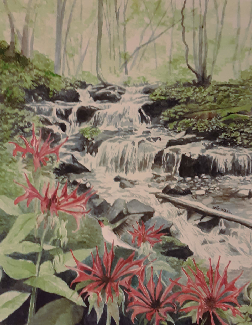 Now, she lives in Western North Carolina and embodies the John Muir quote, “And into the forest I go to lose my mind and find my soul.” She ventures off into the mountains and off the beaten path to find beautiful, peaceful places to sit and draw. This provides her with respite from her main task of caring for her autistic son. Then she can return to the hustle and bustle of her world with a clearer mind and peaceful soul. She also develops and completes the drawings using water to lift the inks and watercolor techniques to add color. Once complete, her images capture the beauty and peace of being in the woods
