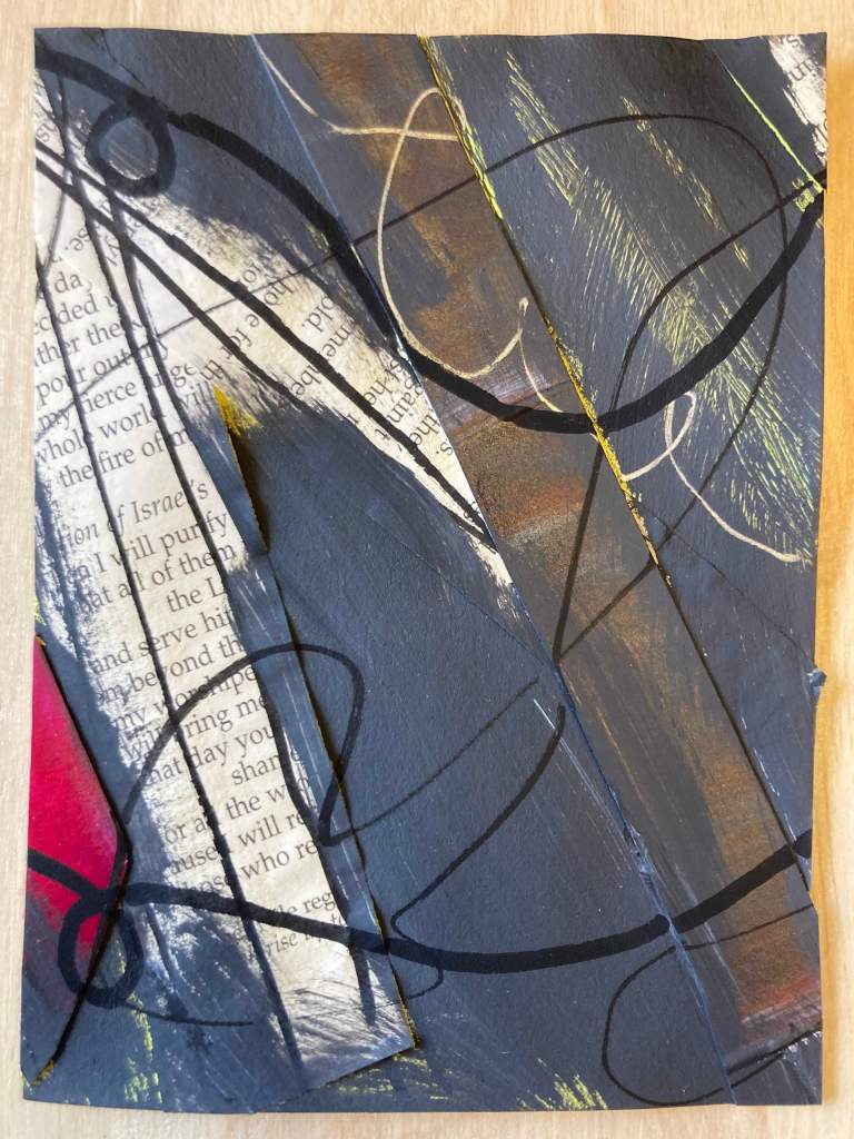 In this April 2026 collection, “New Light, Returning Daily,” I wanted to explore using familiar materials with unfamiliar methods. I combined off-cuts from my “scrapings” paintings, pages from a rescued Bible that had been damaged, and a variety of mixed media materials to make something new with collage in a cohesive collection. When I consider how day-to-day life can feel mundane, the same day-after-day, or simply a repeat of dull life that offers next to no progress, I easily miss the beauty in small, secret, quiet moments. As this series of 30 pieces unfolds, I created it to capture the variety, emotions, beauty, and depth of everyday life on the daily; viewing each piece (or, each day this month) separately may reveal one thing for a viewer, but to experience each piece together may offer a new perspective, a new light, on our everyday mundane upon returning daily.
