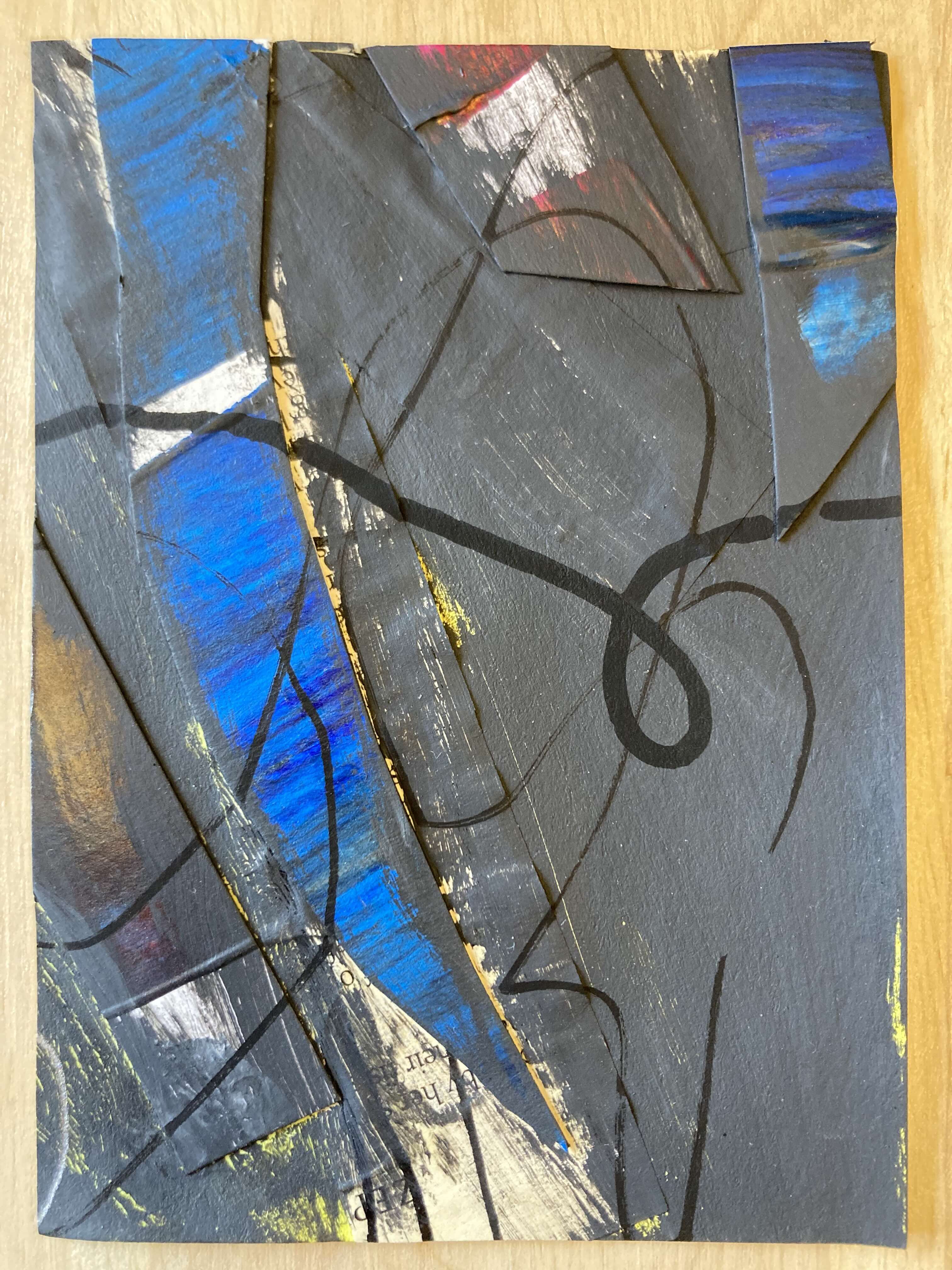 In this April 2026 collection, “New Light, Returning Daily,” I wanted to explore using familiar materials with unfamiliar methods. I combined off-cuts from my “scrapings” paintings, pages from a rescued Bible that had been damaged, and a variety of mixed media materials to make something new with collage in a cohesive collection. When I consider how day-to-day life can feel mundane, the same day-after-day, or simply a repeat of dull life that offers next to no progress, I easily miss the beauty in small, secret, quiet moments. As this series of 30 pieces unfolds, I created it to capture the variety, emotions, beauty, and depth of everyday life on the daily; viewing each piece (or, each day this month) separately may reveal one thing for a viewer, but to experience each piece together may offer a new perspective, a new light, on our everyday mundane upon returning daily.