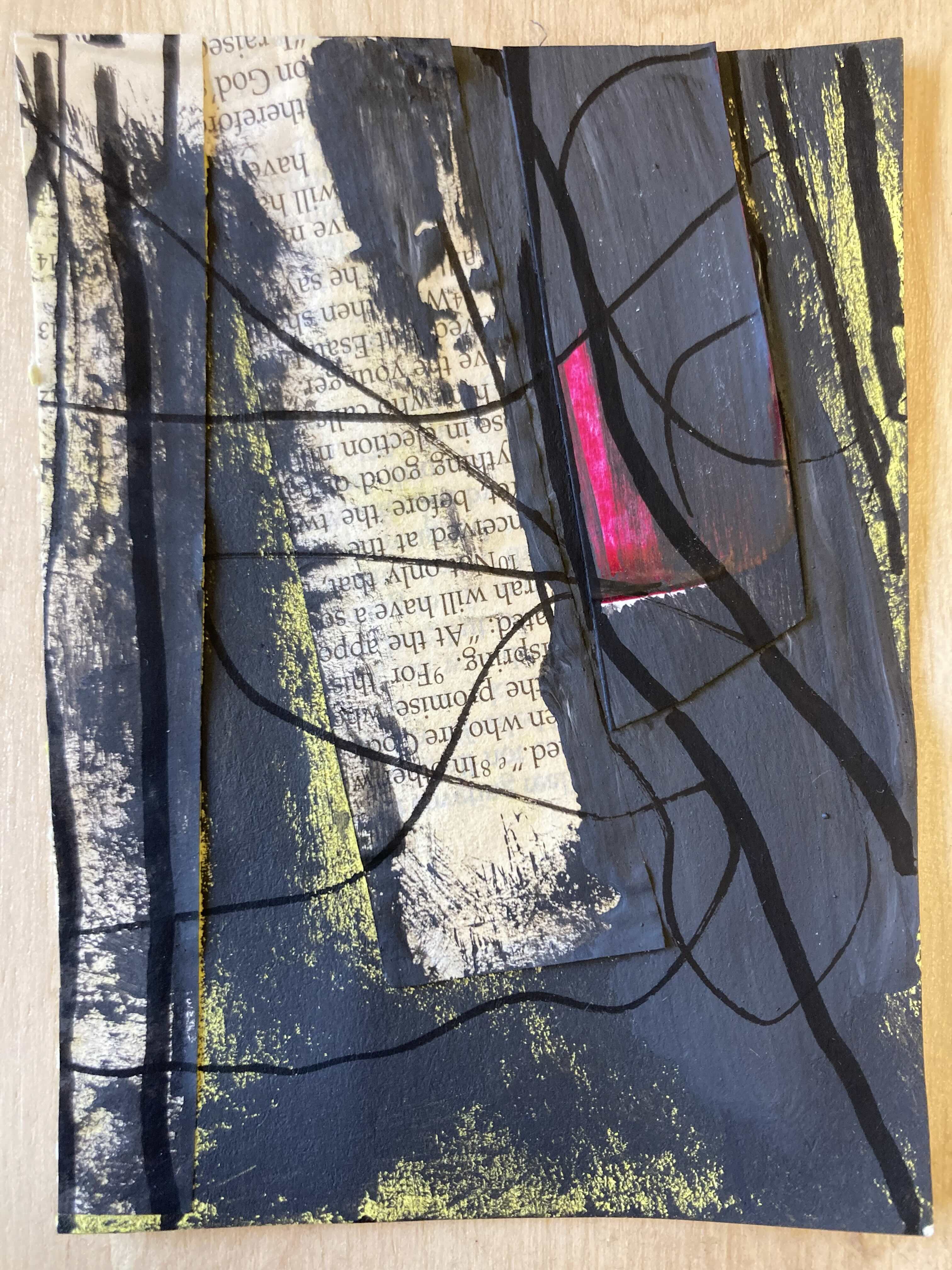 In this April 2026 collection, “New Light, Returning Daily,” I wanted to explore using familiar materials with unfamiliar methods. I combined off-cuts from my “scrapings” paintings, pages from a rescued Bible that had been damaged, and a variety of mixed media materials to make something new with collage in a cohesive collection. When I consider how day-to-day life can feel mundane, the same day-after-day, or simply a repeat of dull life that offers next to no progress, I easily miss the beauty in small, secret, quiet moments. As this series of 30 pieces unfolds, I created it to capture the variety, emotions, beauty, and depth of everyday life on the daily; viewing each piece (or, each day this month) separately may reveal one thing for a viewer, but to experience each piece together may offer a new perspective, a new light, on our everyday mundane upon returning daily.