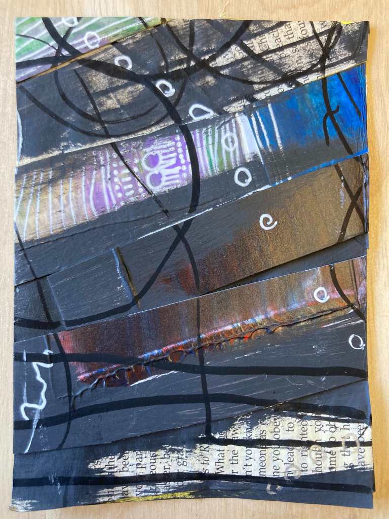 In this April 2026 collection, “New Light, Returning Daily,” I wanted to explore using familiar materials with unfamiliar methods. I combined off-cuts from my “scrapings” paintings, pages from a rescued Bible that had been damaged, and a variety of mixed media materials to make something new with collage in a cohesive collection. When I consider how day-to-day life can feel mundane, the same day-after-day, or simply a repeat of dull life that offers next to no progress, I easily miss the beauty in small, secret, quiet moments. As this series of 30 pieces unfolds, I created it to capture the variety, emotions, beauty, and depth of everyday life on the daily; viewing each piece (or, each day this month) separately may reveal one thing for a viewer, but to experience each piece together may offer a new perspective, a new light, on our everyday mundane upon returning daily.