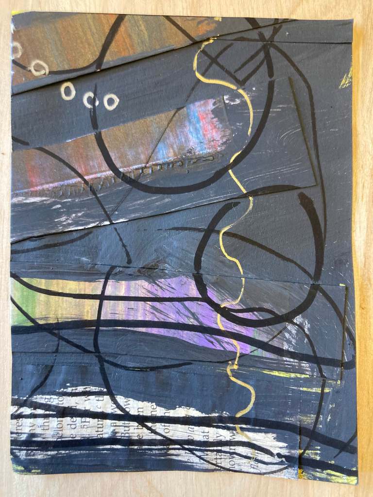 In this April 2026 collection, “New Light, Returning Daily,” I wanted to explore using familiar materials with unfamiliar methods. I combined off-cuts from my “scrapings” paintings, pages from a rescued Bible that had been damaged, and a variety of mixed media materials to make something new with collage in a cohesive collection. When I consider how day-to-day life can feel mundane, the same day-after-day, or simply a repeat of dull life that offers next to no progress, I easily miss the beauty in small, secret, quiet moments. As this series of 30 pieces unfolds, I created it to capture the variety, emotions, beauty, and depth of everyday life on the daily; viewing each piece (or, each day this month) separately may reveal one thing for a viewer, but to experience each piece together may offer a new perspective, a new light, on our everyday mundane upon returning daily.