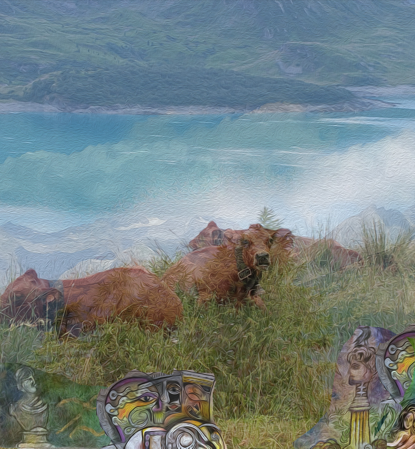 FHP24 Tranquil Ancient races lie buried in time, beneath a bucolic calm. Docile cattle graze, soft-mouthed and unknowing, among the remnants of bloodied ground above temples and statues, standing dark, silent, their eyes emptied into chasms no hand has traced. Ghosts keep their vigil, watching as time unthreads the world. Nature loosens the seams, reveals what was hidden, and writes again what they once made. Jen Thorne