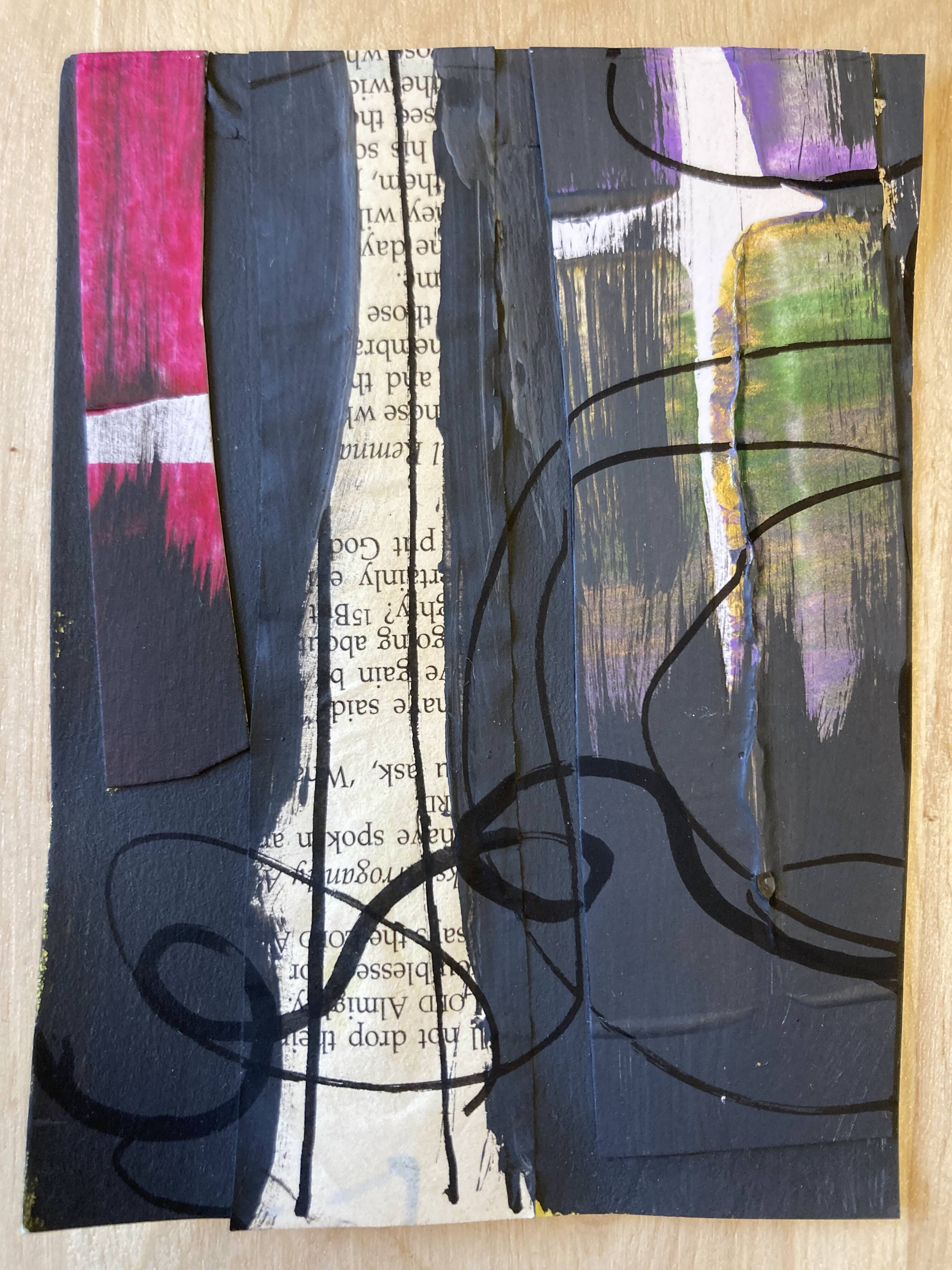 In this April 2026 collection, “New Light, Returning Daily,” I wanted to explore using familiar materials with unfamiliar methods. I combined off-cuts from my “scrapings” paintings, pages from a rescued Bible that had been damaged, and a variety of mixed media materials to make something new with collage in a cohesive collection. When I consider how day-to-day life can feel mundane, the same day-after-day, or simply a repeat of dull life that offers next to no progress, I easily miss the beauty in small, secret, quiet moments. As this series of 30 pieces unfolds, I created it to capture the variety, emotions, beauty, and depth of everyday life on the daily; viewing each piece (or, each day this month) separately may reveal one thing for a viewer, but to experience each piece together may offer a new perspective, a new light, on our everyday mundane upon returning daily.