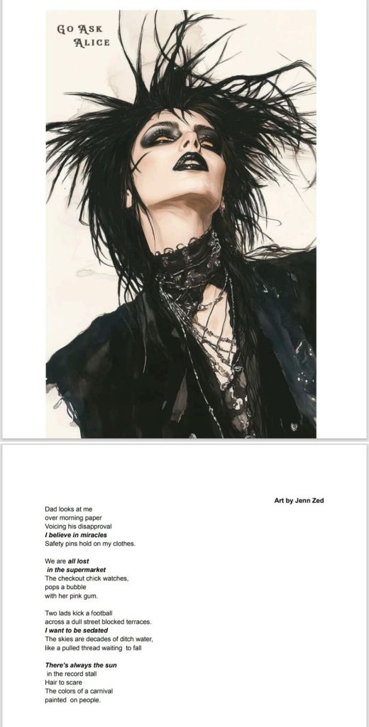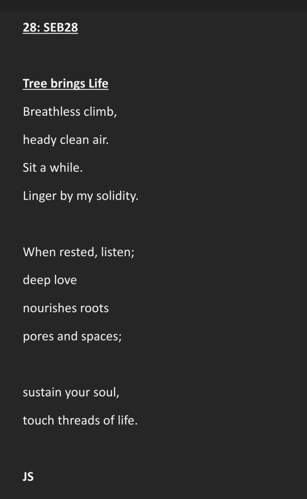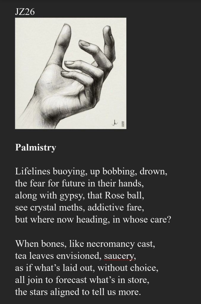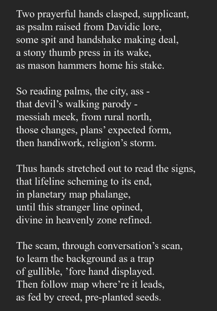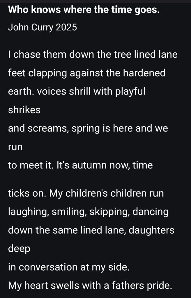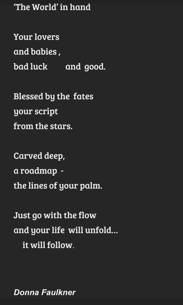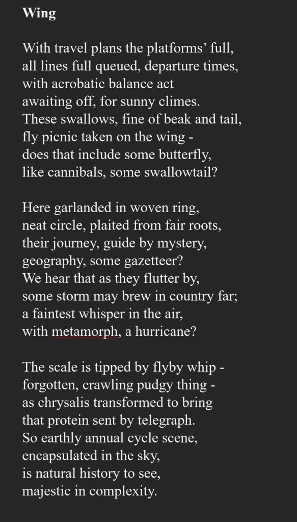 A4 (2023): Because of the way an idea develops into one of my poems, starting off with how a line sounds to me out loud, and then getting the subsequent lines to develop from that beginning, and often in relation to that original rhythm, there probably aren’t many of my poems that adhere strictly to any classical forms. I do enjoy reading “form” poetry and have tried to write villanelles, sonnets and other forms in workshops etc. but they haven’t been the ones that I have had published, so as yet, it is not a strength I can claim. I think, because my poems all tend to start life orally, they do have elements of conversational/everyday speech in them and so there are bits of naturally occurring/accidental iambic pentameter, and some bits might resemble other elements of form too. And when the words make it onto the page, I find the shape of poems is becoming more interesting to me, but then I’m not sure that’s exactly what you mean by “form” in your question.