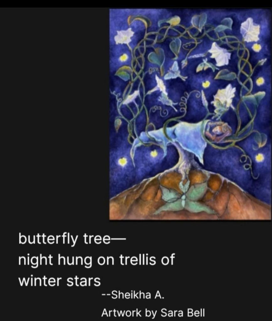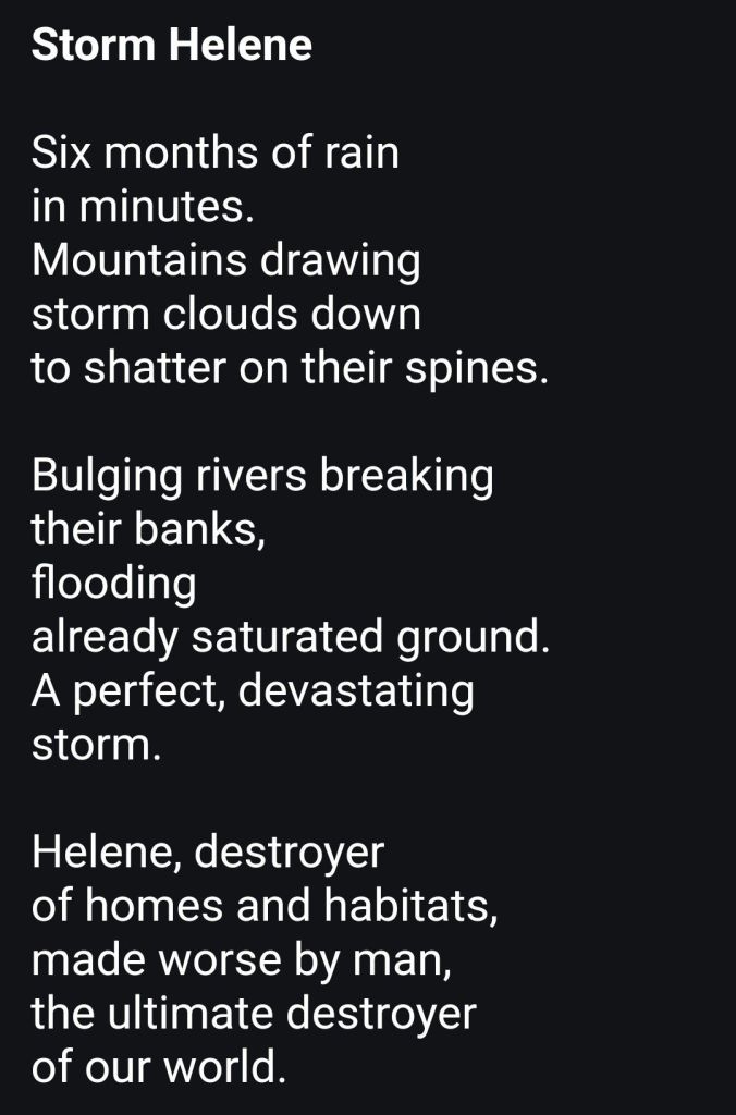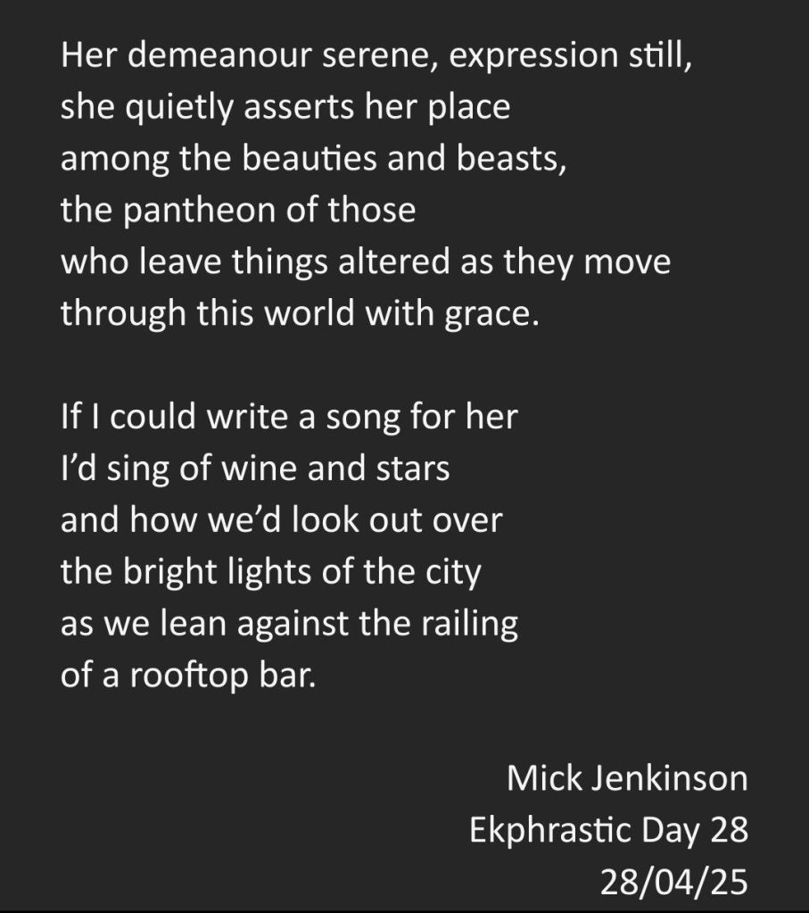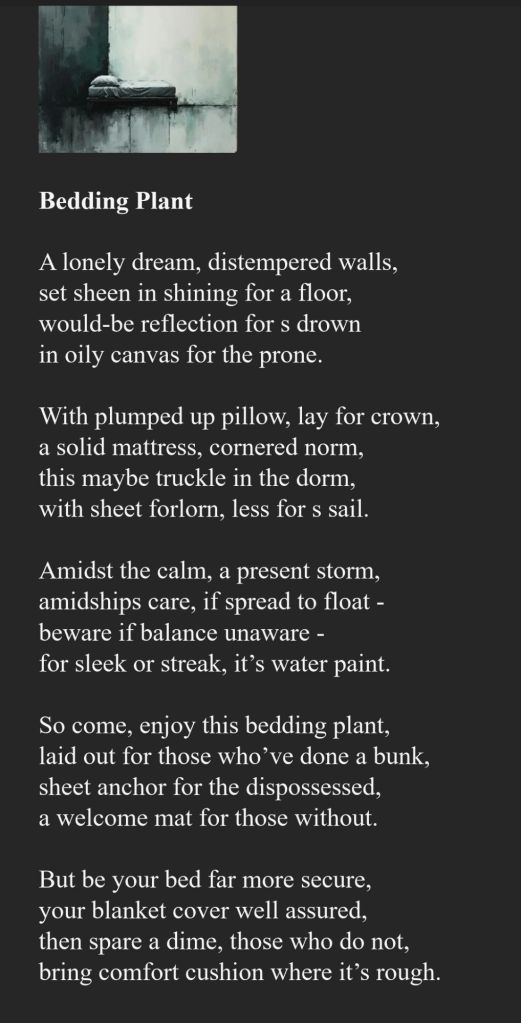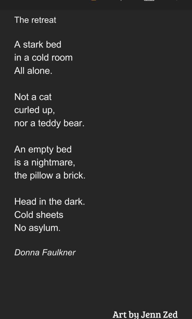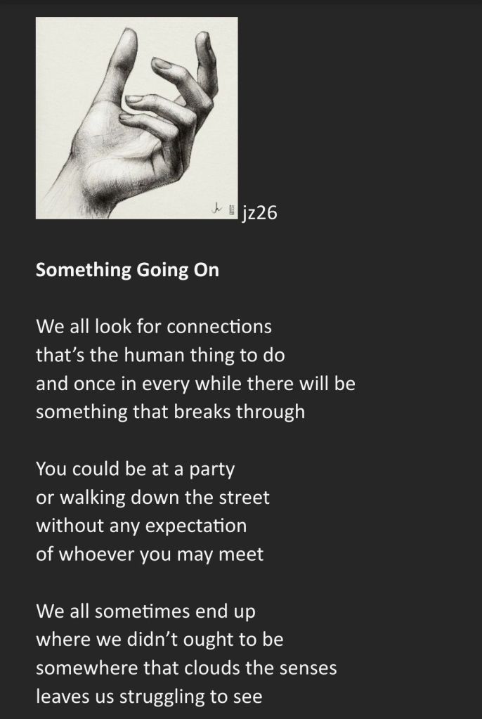 A4 (2023): Because of the way an idea develops into one of my poems, starting off with how a line sounds to me out loud, and then getting the subsequent lines to develop from that beginning, and often in relation to that original rhythm, there probably aren’t many of my poems that adhere strictly to any classical forms. I do enjoy reading “form” poetry and have tried to write villanelles, sonnets and other forms in workshops etc. but they haven’t been the ones that I have had published, so as yet, it is not a strength I can claim. I think, because my poems all tend to start life orally, they do have elements of conversational/everyday speech in them and so there are bits of naturally occurring/accidental iambic pentameter, and some bits might resemble other elements of form too. And when the words make it onto the page, I find the shape of poems is becoming more interesting to me, but then I’m not sure that’s exactly what you mean by “form” in your question.