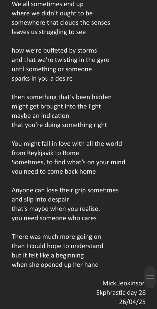 A3 (2025): Narrative has become more important to me during the writing of the last two collections. I wanted to tell more stories alongside the more lyrical poems that I continue to write. I felt able to be more open and honest with the reader by writing more narrative poems such as “Said big me to little me” and “I met him at a counter-demonstration” in “Untanglement”, and I felt that improved all my writing because of this more open, honest approach, and I hope that trend has and will continue.