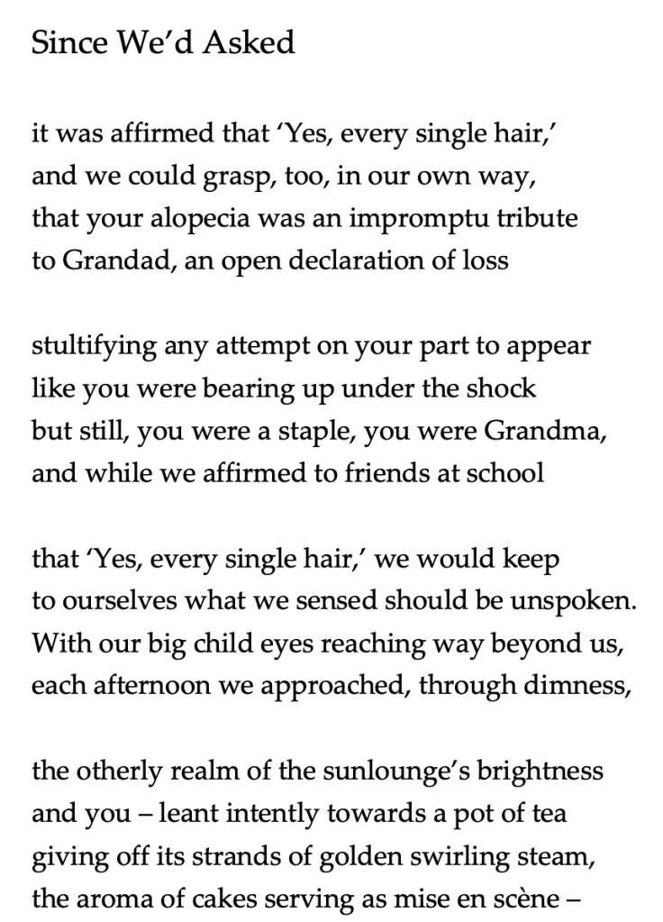 I was interested in the way ‘mother’ is both a role and a relationship, so I wanted to retain that aspect in the order, too. So The Shed, for example, explores the way ‘Mother’ is a term that children use when an emotional distance has been created (as they observe a mother who is struggling). This poem, though it ‘feels’ like it could be in the first half of the book, is a reminder that there isn’t a perfect ‘mother’. Being an ill-prepared child-mother or finding oneself in difficult circumstances, eg a marital breakup and its aftermath, can potentially derail a parent/child relationship. If The Shed had been in the earlier part of the pamphlet, it could have suggested a simplistic judgment to which I wanted to add some balance.